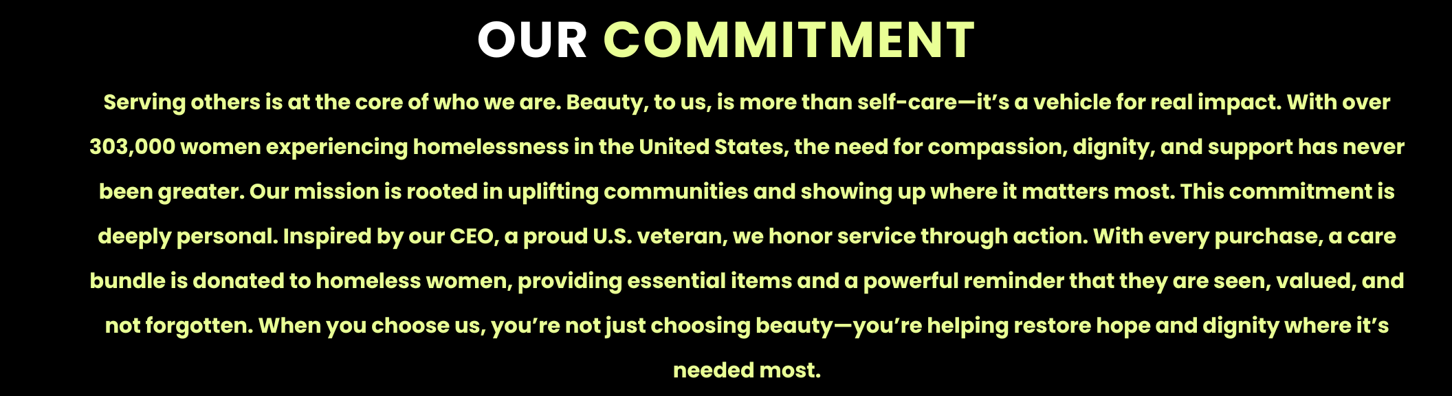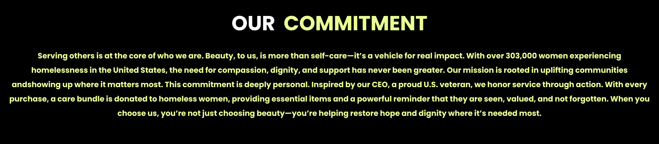 "Our dedication to beauty and self-care is at the core of what we do. Driven by sustainability and community impact, we aspire to inspire women and men through empowerment, inclusion, innovation and education."