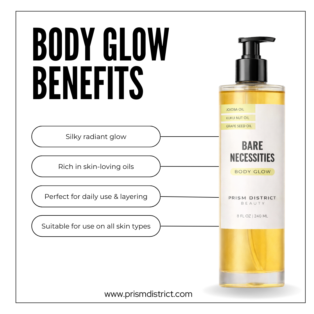 Bare Necessities Body Glow is a fast-absorbing, glow-enhancing blend designed to nourish, soften, and illuminate the skin—without added fragrance. Thoughtfully minimal and effortlessly refined, Bare Necessities elevates your daily ritual with clean hydration and a natural, healthy radiance. Skin is left smooth, luminous, and beautifully bare.